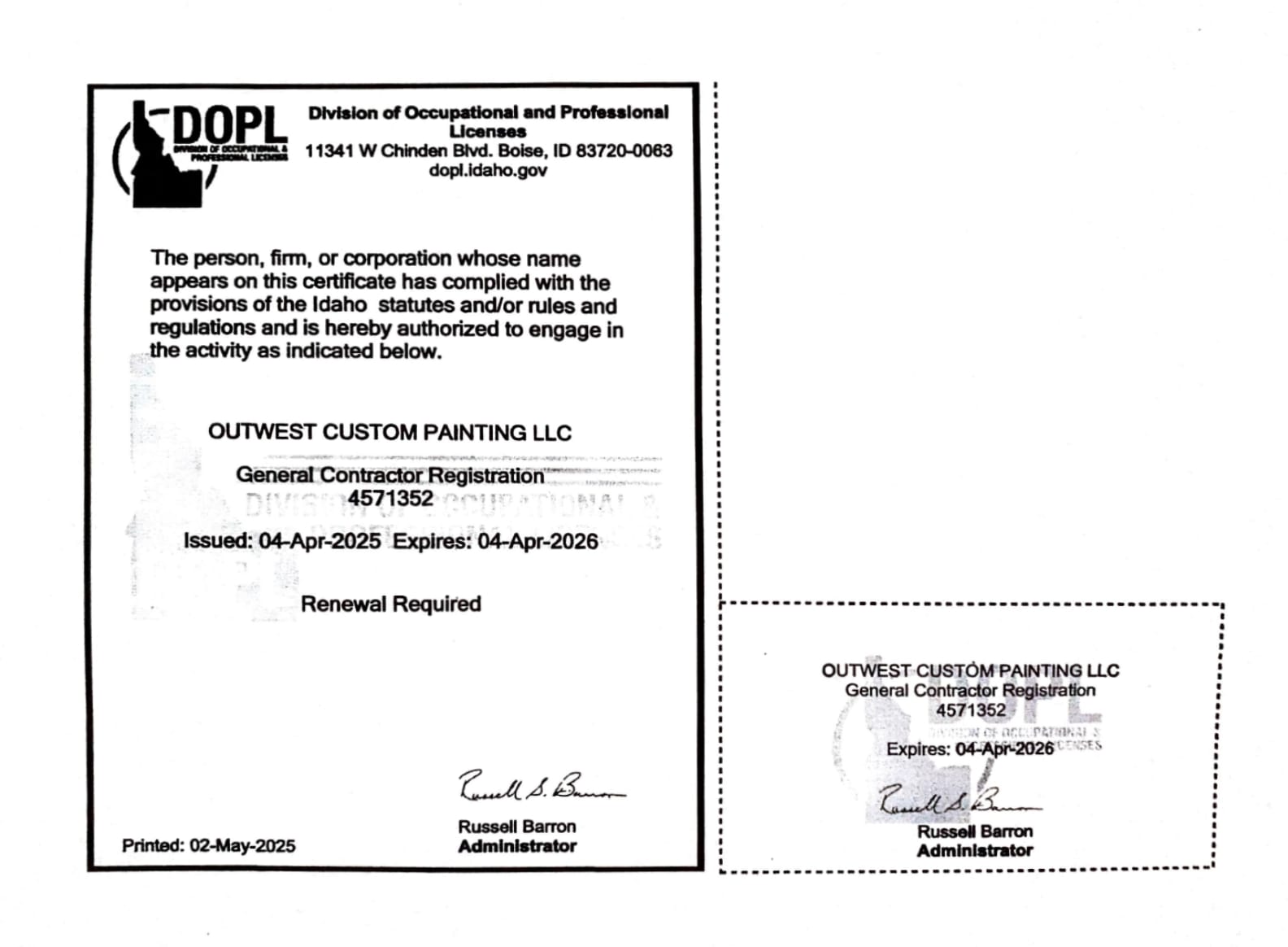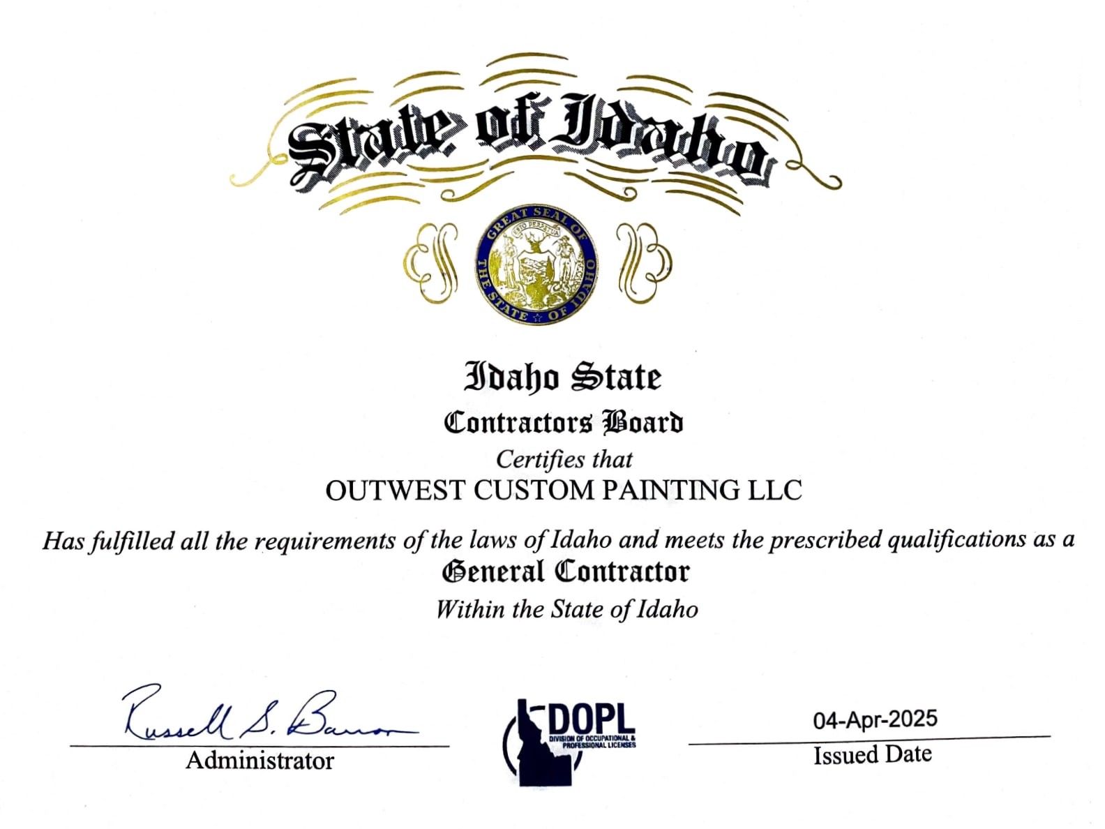 At Outwest Custom Painting, we take your trust seriously. As a fully certified General Contractor by the Idaho State Contractors Board and proudly licensed and registered through the Division of Occupational and Professional Licenses, we meet all state requirements to operate legally and responsibly. These credentials reflect our commitment to quality, safety, and standards in every project we take on.